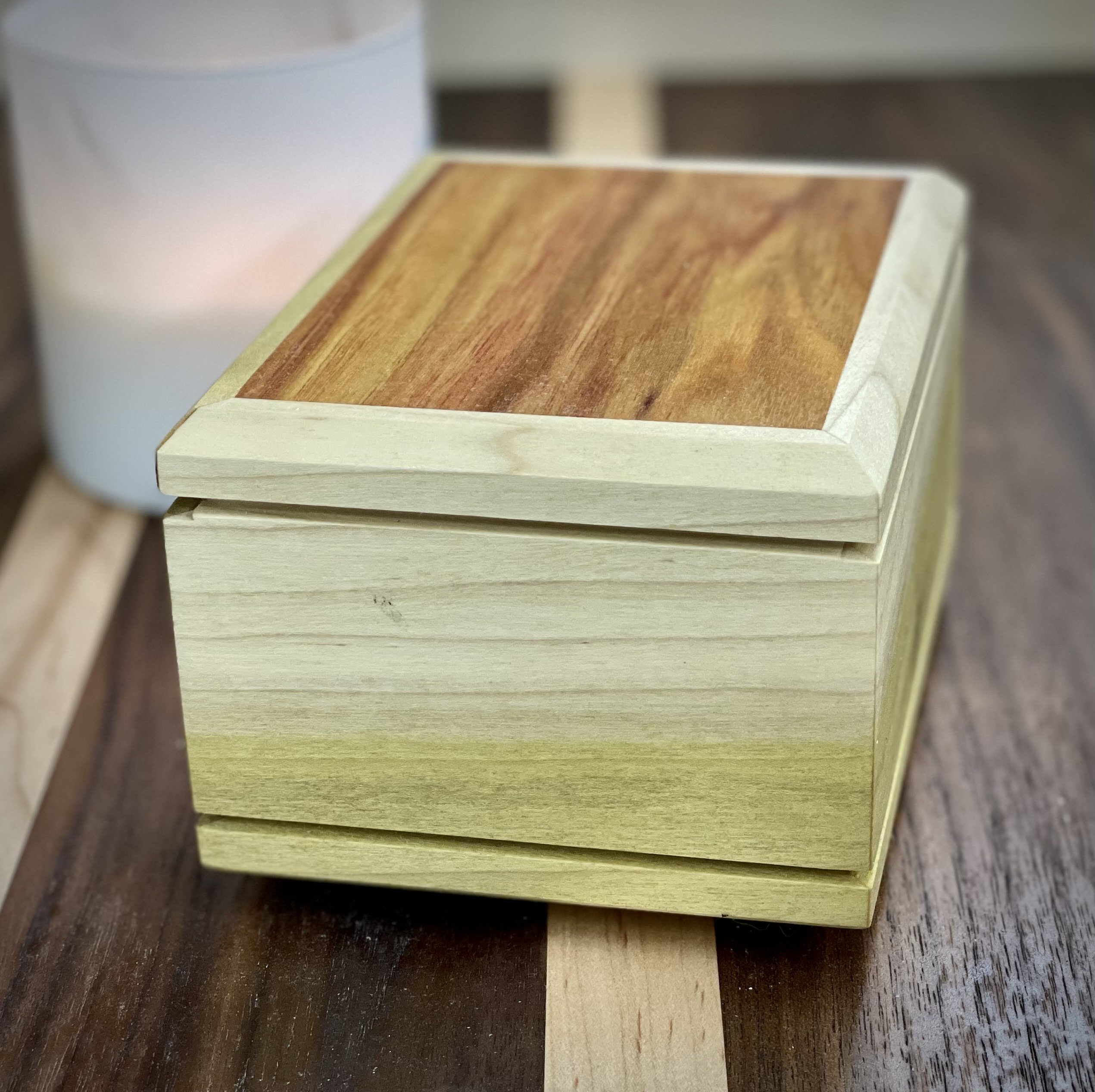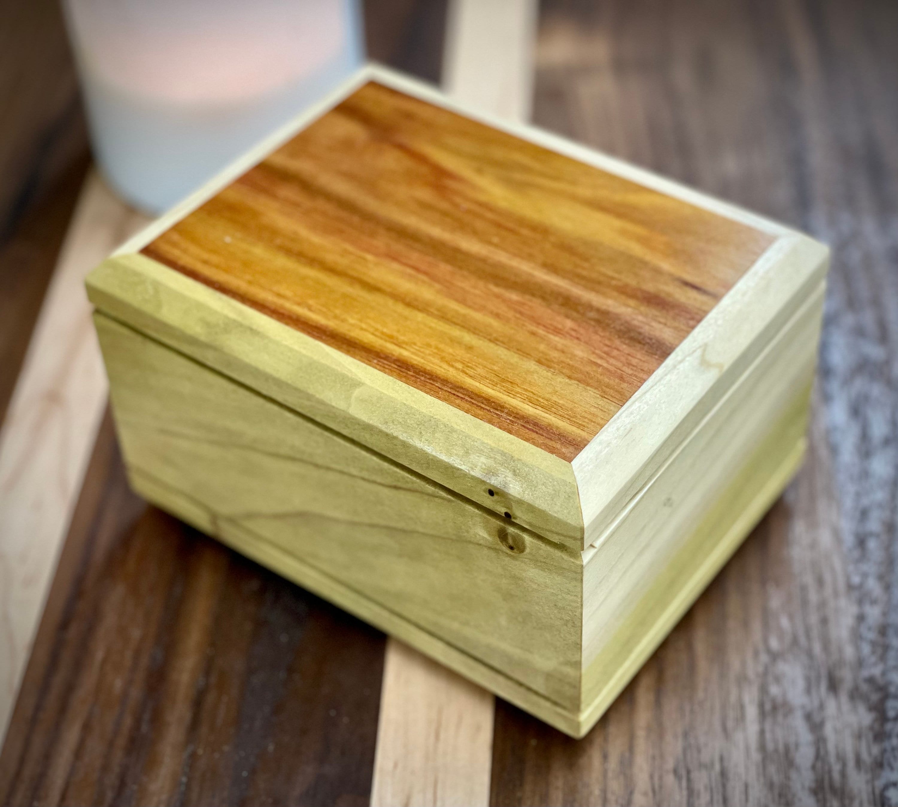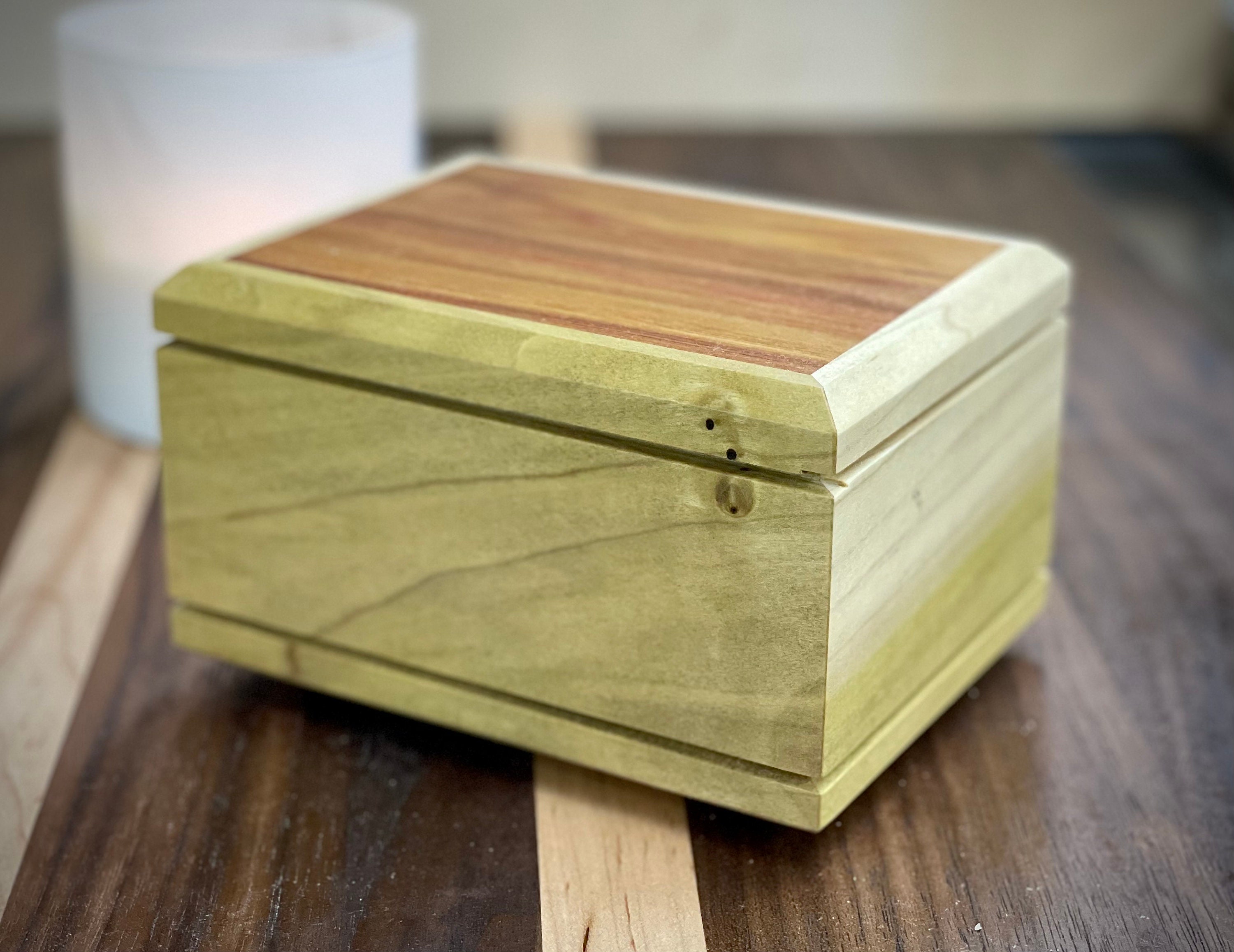 Small to medium - Handmade pet urn, Poplar wood with embedded canary wood top. Holds up to 43 cubic inches of ashes. Includes removable screw on base, rubber footing and polyurethane spray coating. All urns are made in our own little shop in Austin, Tx with pride and care. This is a great way to memorialize your beloved pet, can be personalized if you wish. Engraving is included.