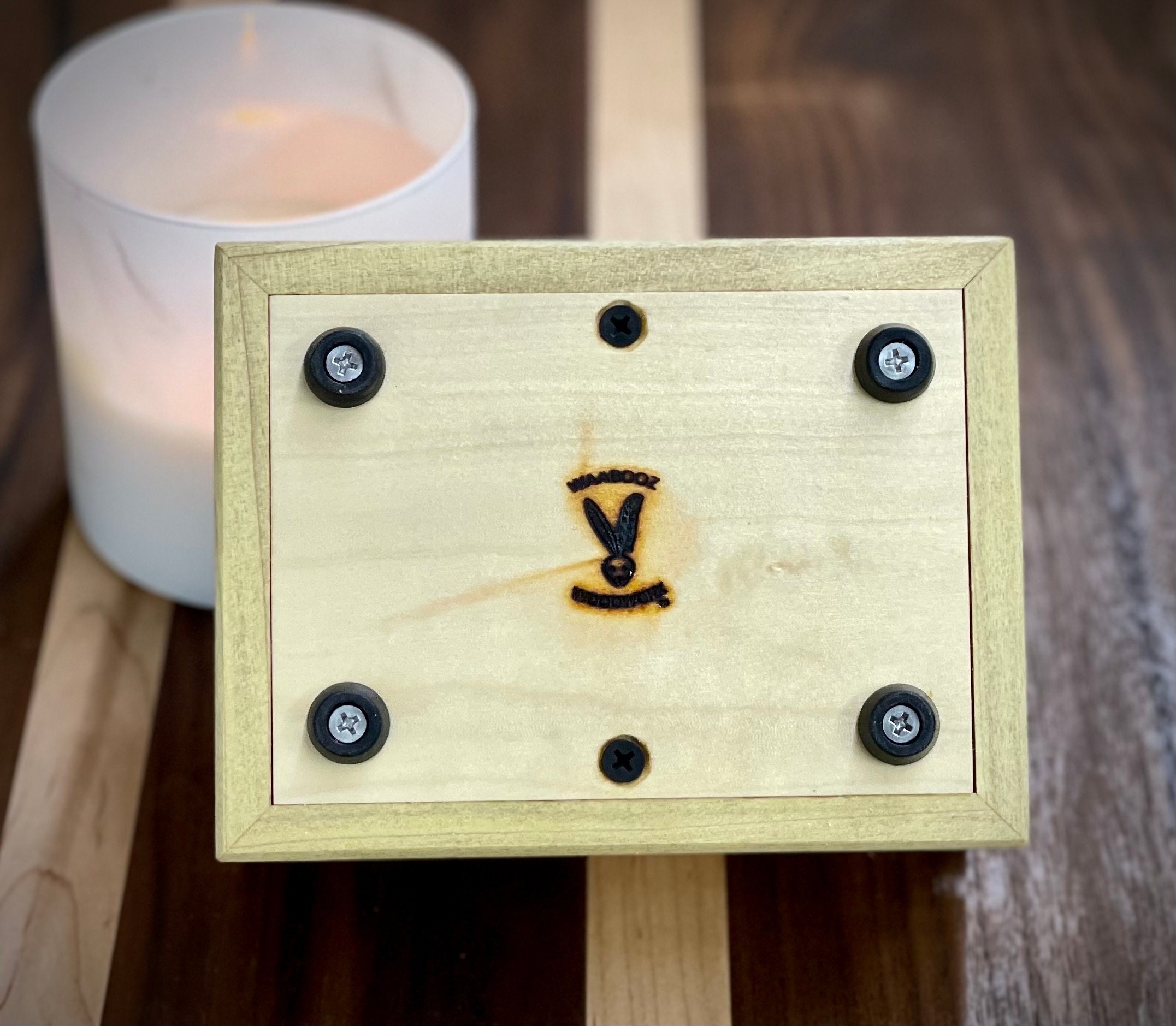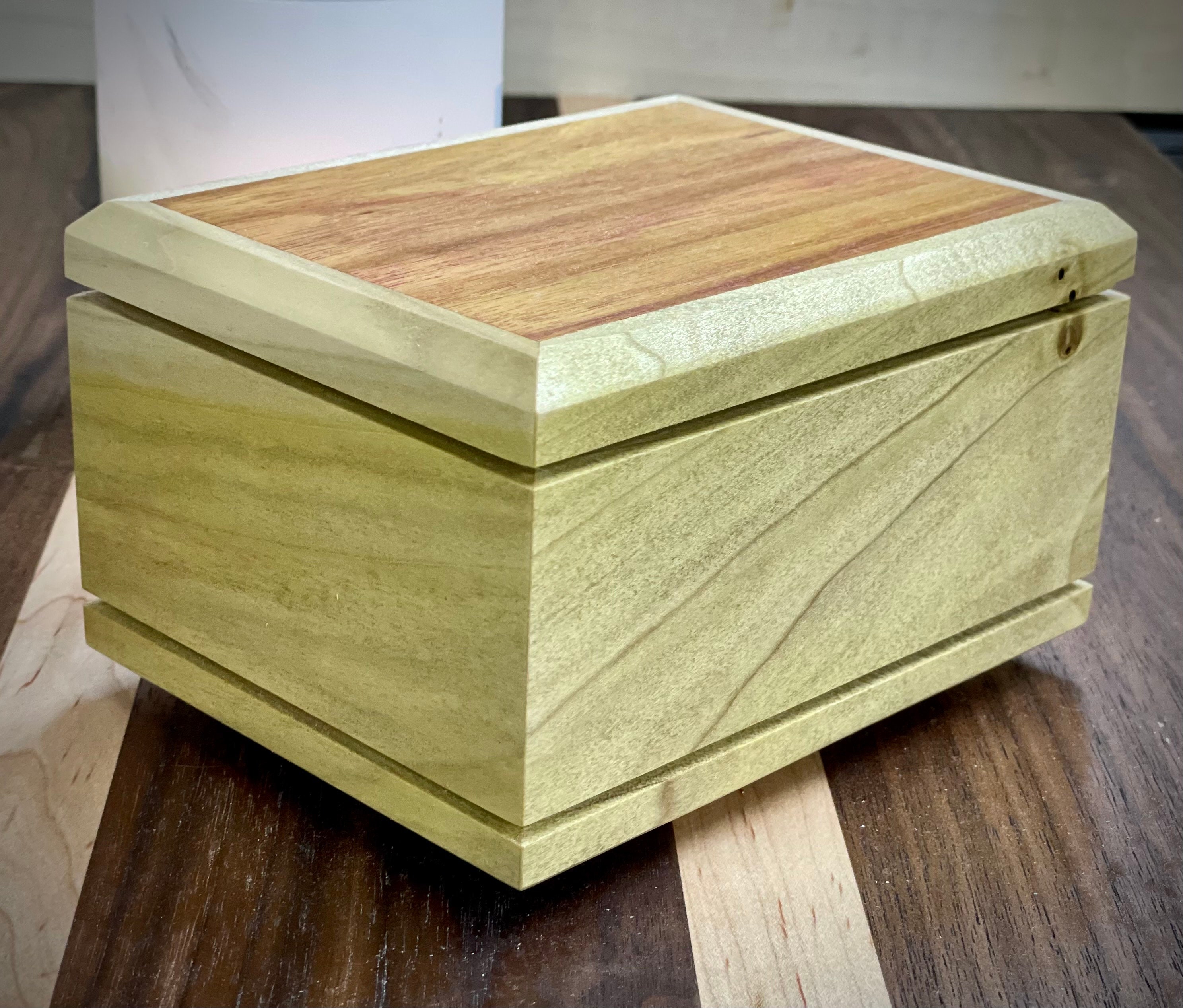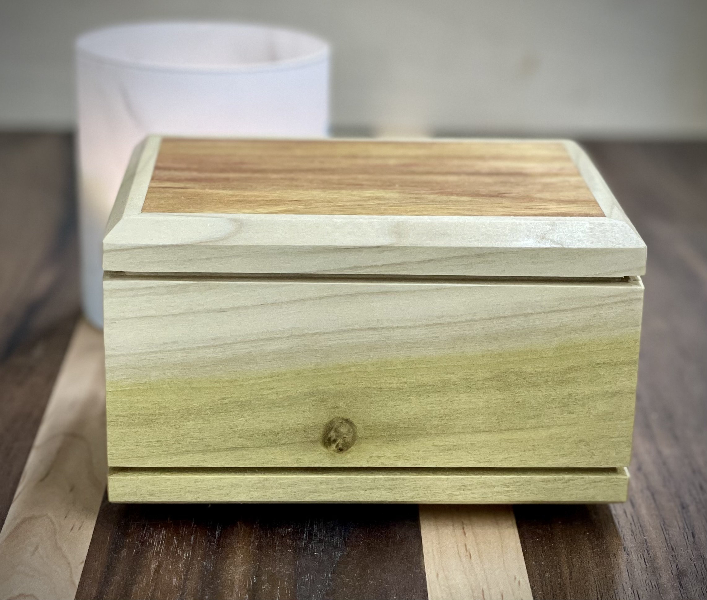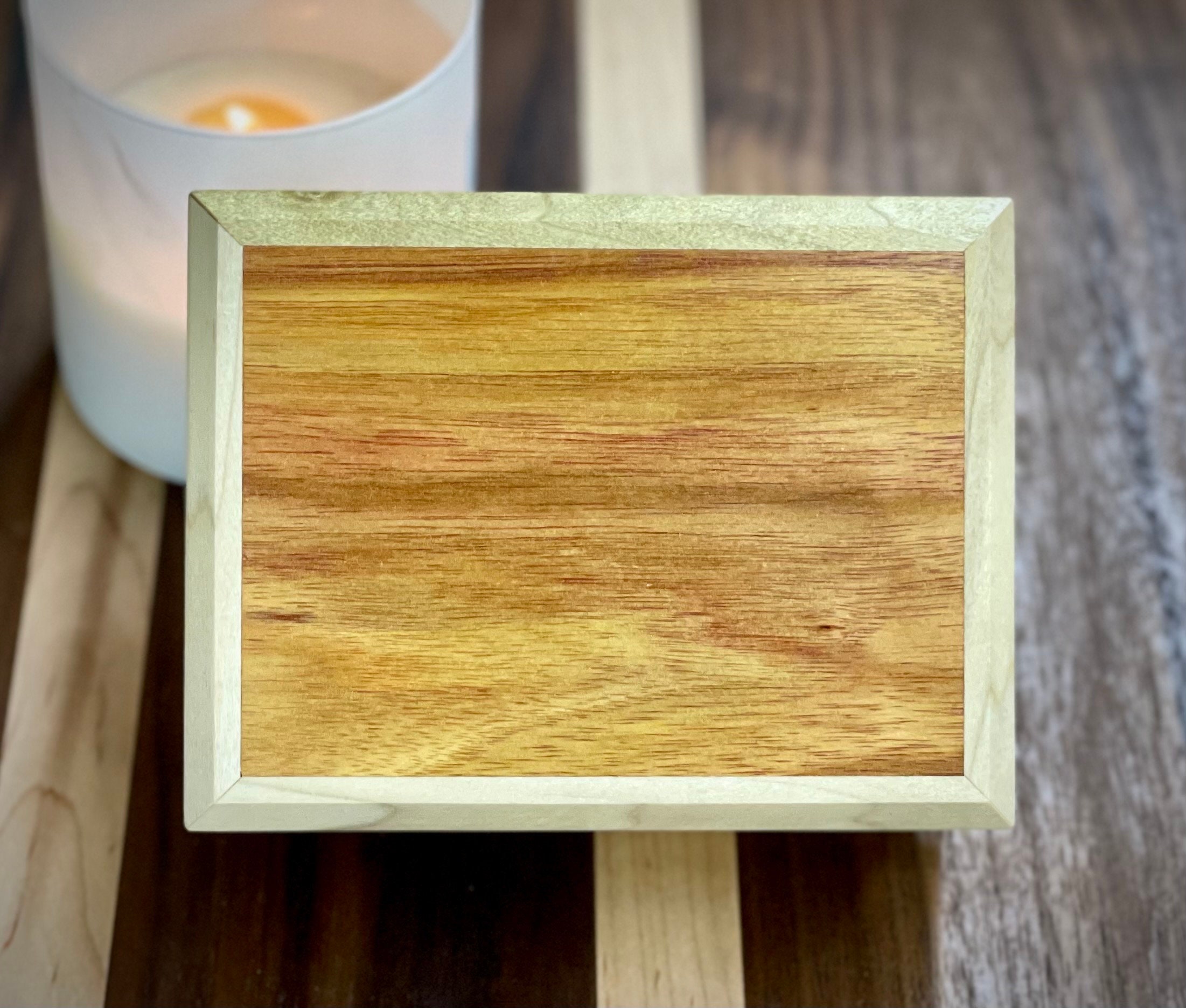 Small to medium - Handmade pet urn, Poplar wood with embedded canary wood top. Holds up to 43 cubic inches of ashes. Includes removable screw on base, rubber footing and polyurethane spray coating. All urns are made in our own little shop in Austin, Tx with pride and care. This is a great way to memorialize your beloved pet, can be personalized if you wish. Engraving is included.