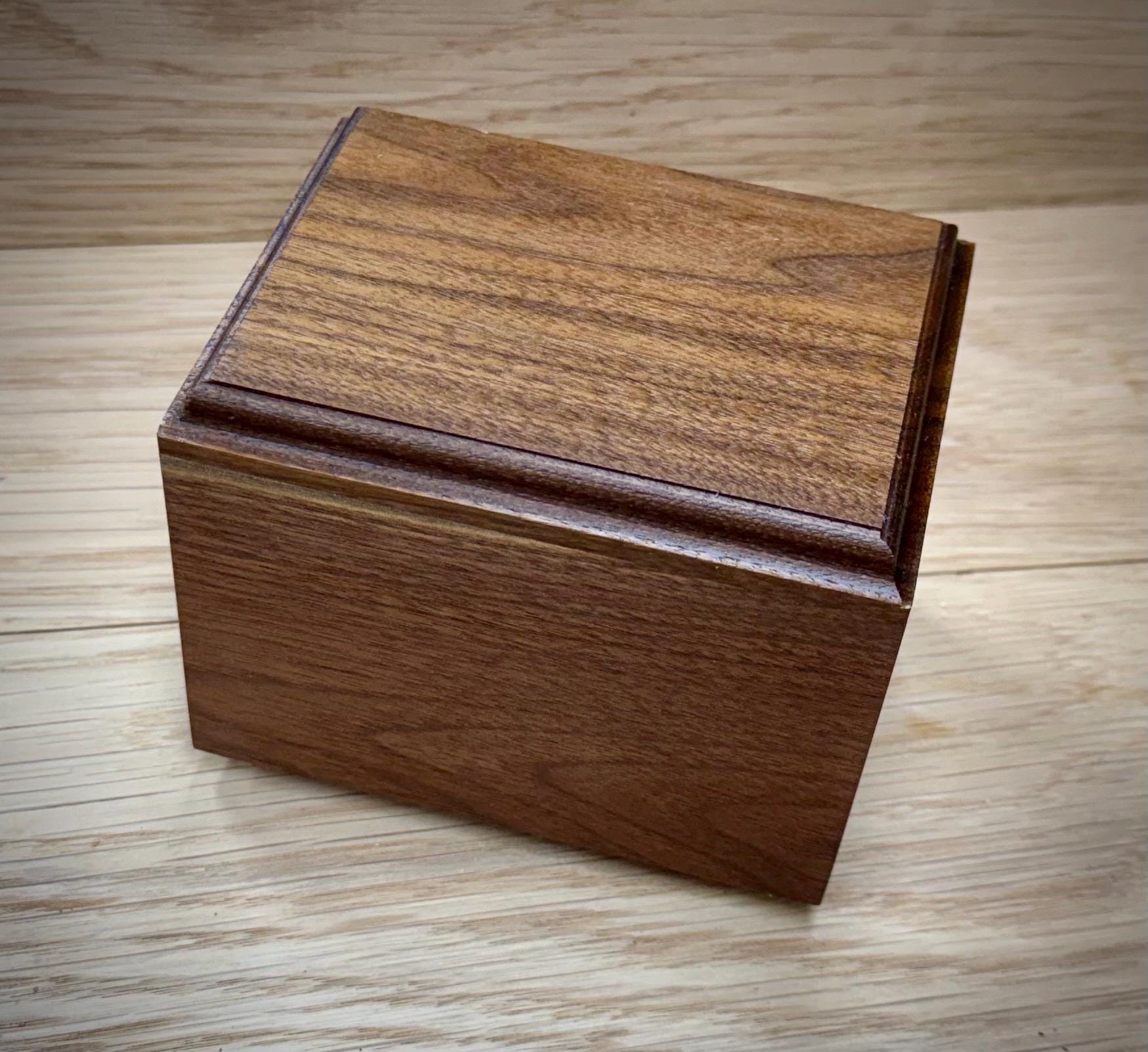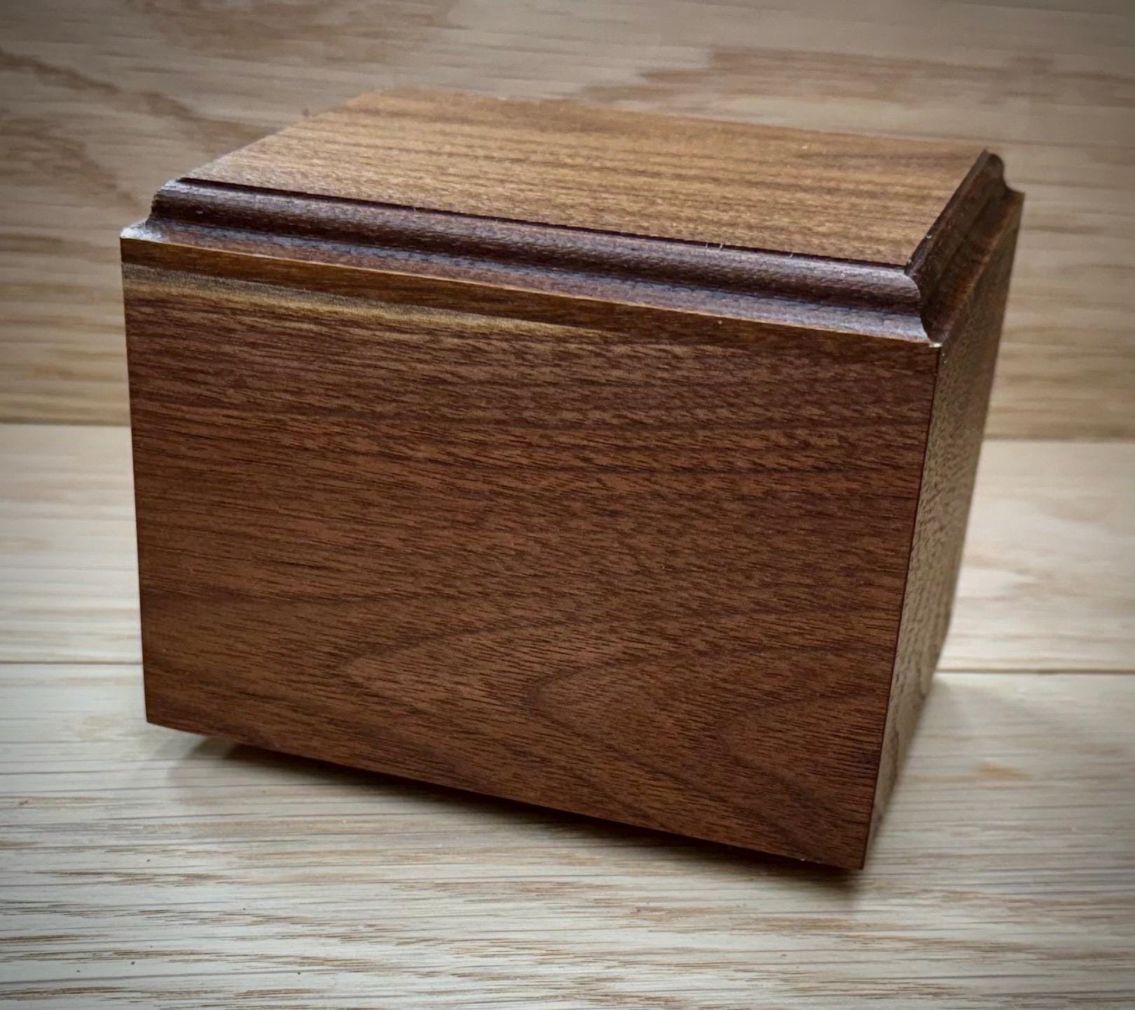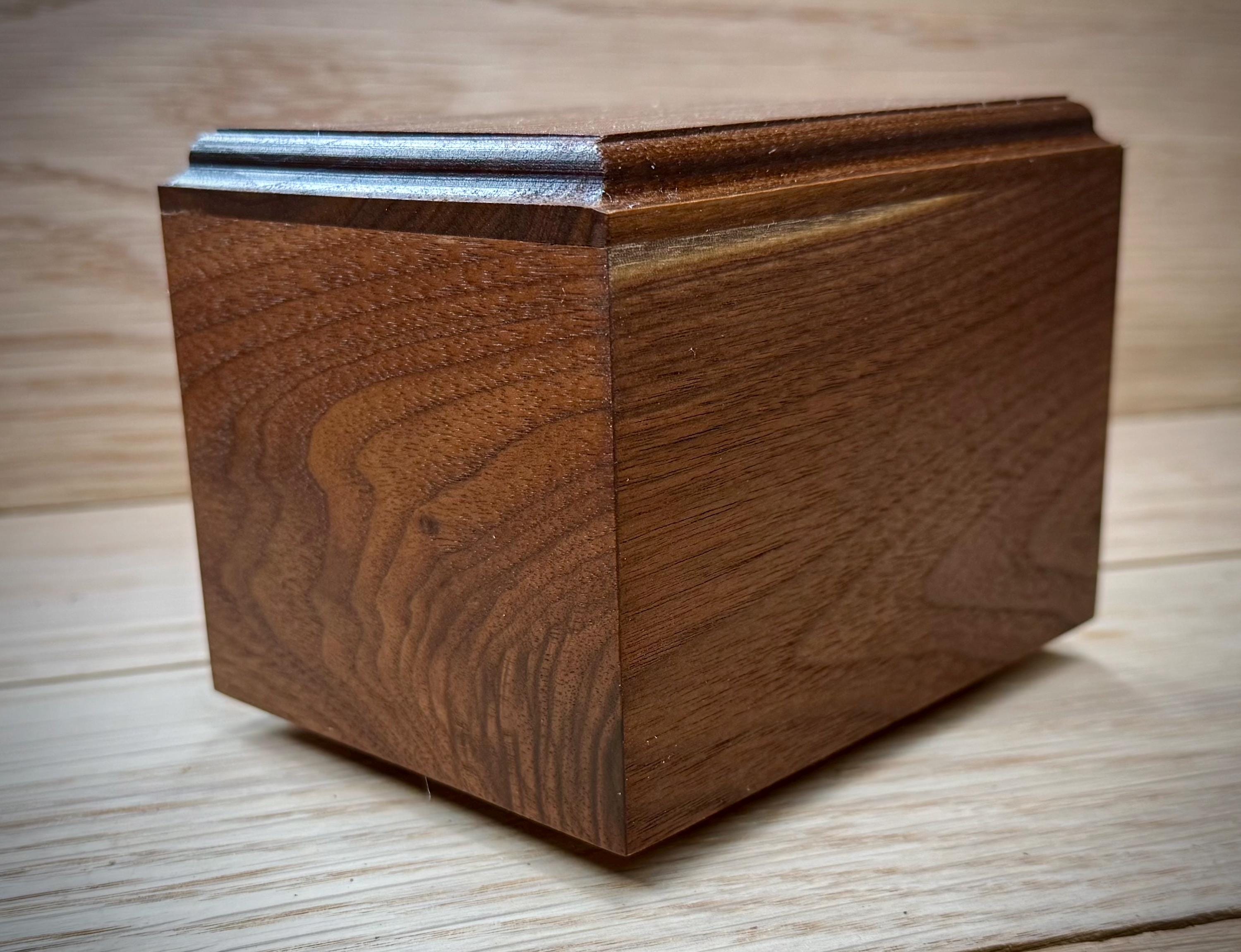 Beautiful small rustic walnut pet urn for ashes to memorialize your beloved pet. Finished with danish oil and a polyurethane coating, rubber footing, Our urns are made in a little shop in Austin, Texas utilizing re-claimed wood or sustainably sourced wood. Can be personalized, please see our font selection in photos.